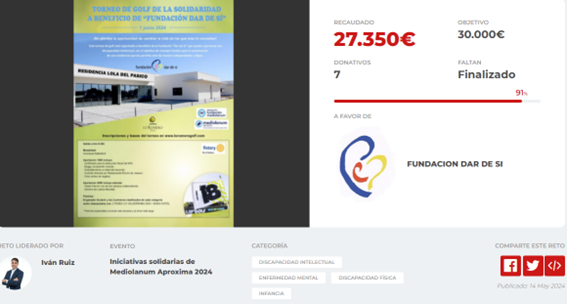 En el marco del proyecto “Mediolanum Aproxima” el Family Banker Iván Ruiz Román padrino de la Fundación Dar de Sí, participó en la organización y en el éxito del Torneo de golf solidario.