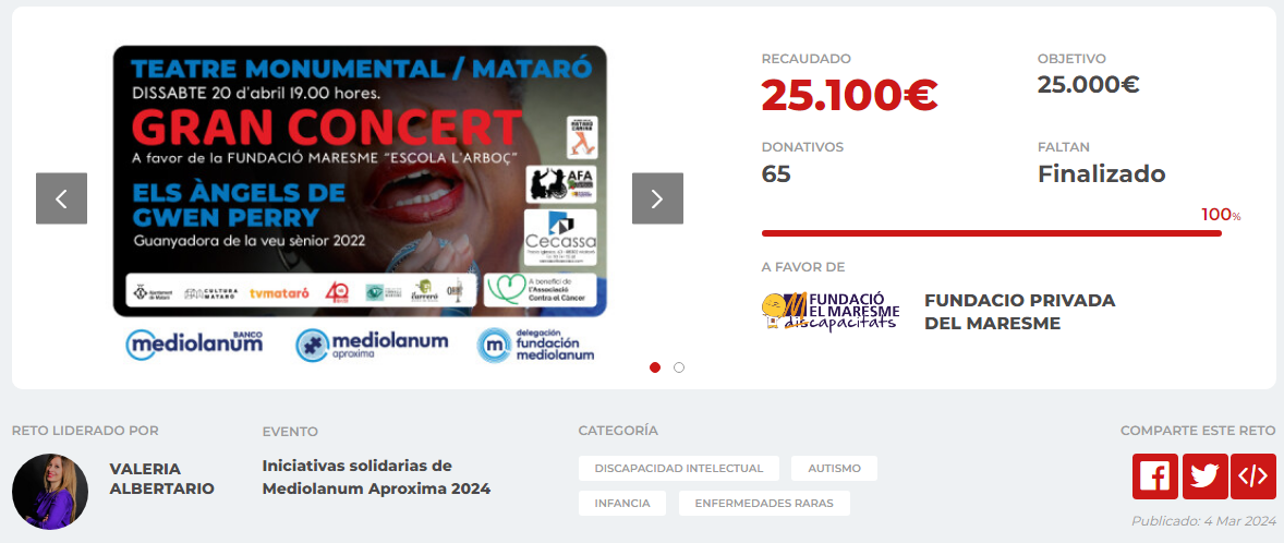 La Fundación Privada Pro Personas con Disminución Psíquica ha recibido una donación total de 35.100 € de los que 25.100 euros fueron recaudados en el concierto y 10.000 euros más aportados por la Fundación Mediolanum en España*